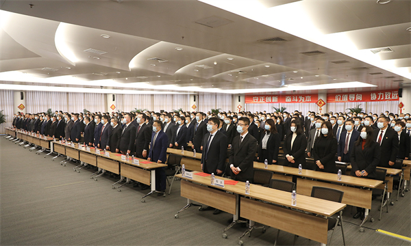 会议在庄严的国歌声中开启各项议程,张进总裁在会上作主题为《勠力拼搏启新程 勇毅奋进创未来》的年度工作报告。