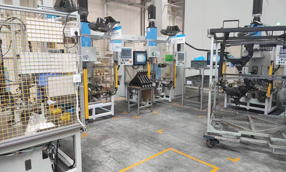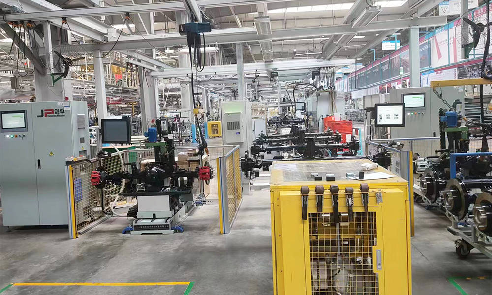 适用于汽车底盘总成装配,包含后桥分装总成装配线、前减速器分装总成装配线、前转向节和轮毂制动器总成装配线及前悬架下控制臂总成装配线。产品主要用于承载式及非承载式车身底盘装配。涵括生产管理系统、托盘夹具、物流输送线、衬套压装机、桥壳涂胶机、拧紧机、打标机、称重注油系统、ABS传感器检测系统、盘跳检测系统、泄漏测试机、翻转机、悬挂起重机、钢结构、隔音间、照明风扇系统等各种设备及工具。